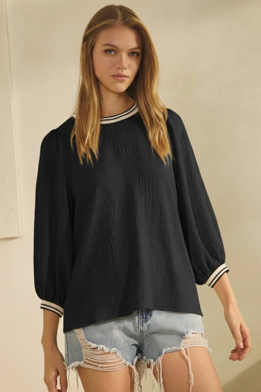 This black solid airflow top brings lightweight comfort with subtle, elevated detail. Designed with a striped ribbed neckline and softly cuffed balloon sleeves, it blends relaxed movement with a polished finish. Easy to dress up or down, this top pairs beautifully with denim, trousers, or skirts for everyday or evening wear.
