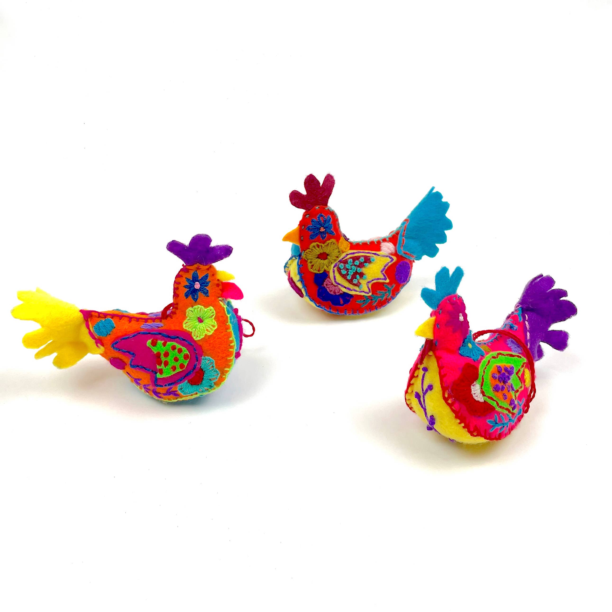 Brighten up your holiday décor with these charming Embroidered Hen Ornaments. Handcrafted by artisans in Oaxaca, Mexico, each felt hen is carefully hand-embroidered with intricate details, bringing warmth and character to any space. These delightful ornaments come in a set of three assorted colors, making them a perfect gift or festive addition to your home.