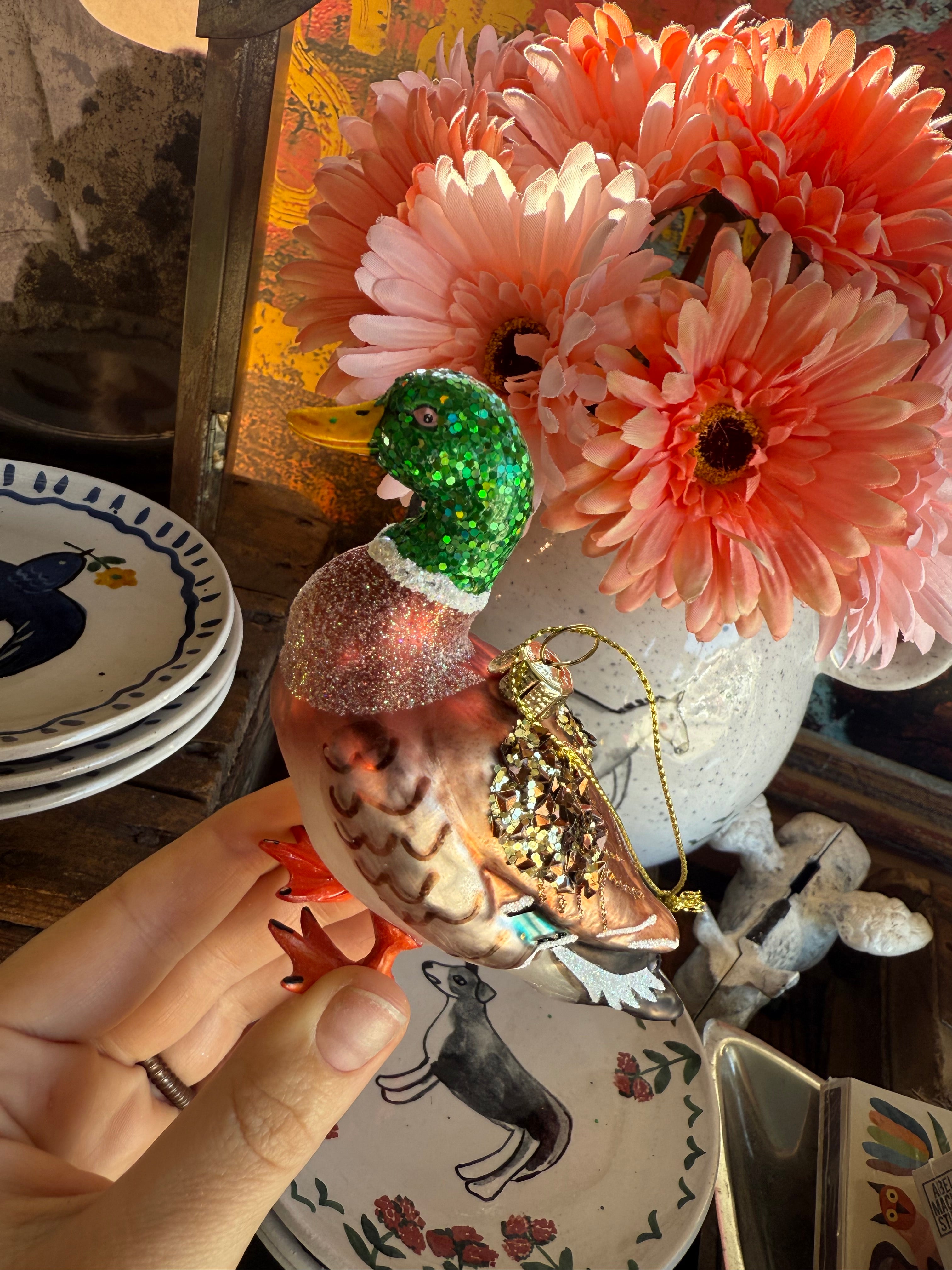 This charming 4.75" glass Mallard ornament brings a touch of southern woodland beauty to your home or holiday decor. Its delicate craftsmanship captures the mallard's graceful form, perfect for adding a bit of nature’s charm to your tree or mantel. A lovely keepsake for those who appreciate classic southern wildlife and rustic elegance.