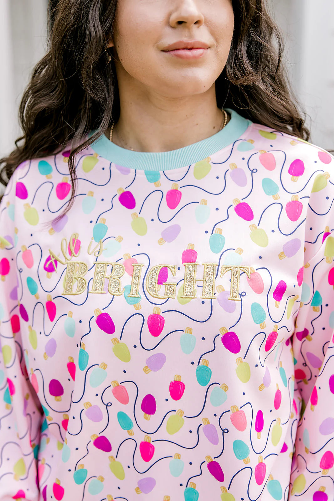 Cozy and vivid, this sweatshirt is just right for adding some sparkle to your holiday closet. Glow all season long in this festive multi-colored Christmas light sweatshirt, adorned with a golden "All is Bright" script for that extra touch of holiday charm.