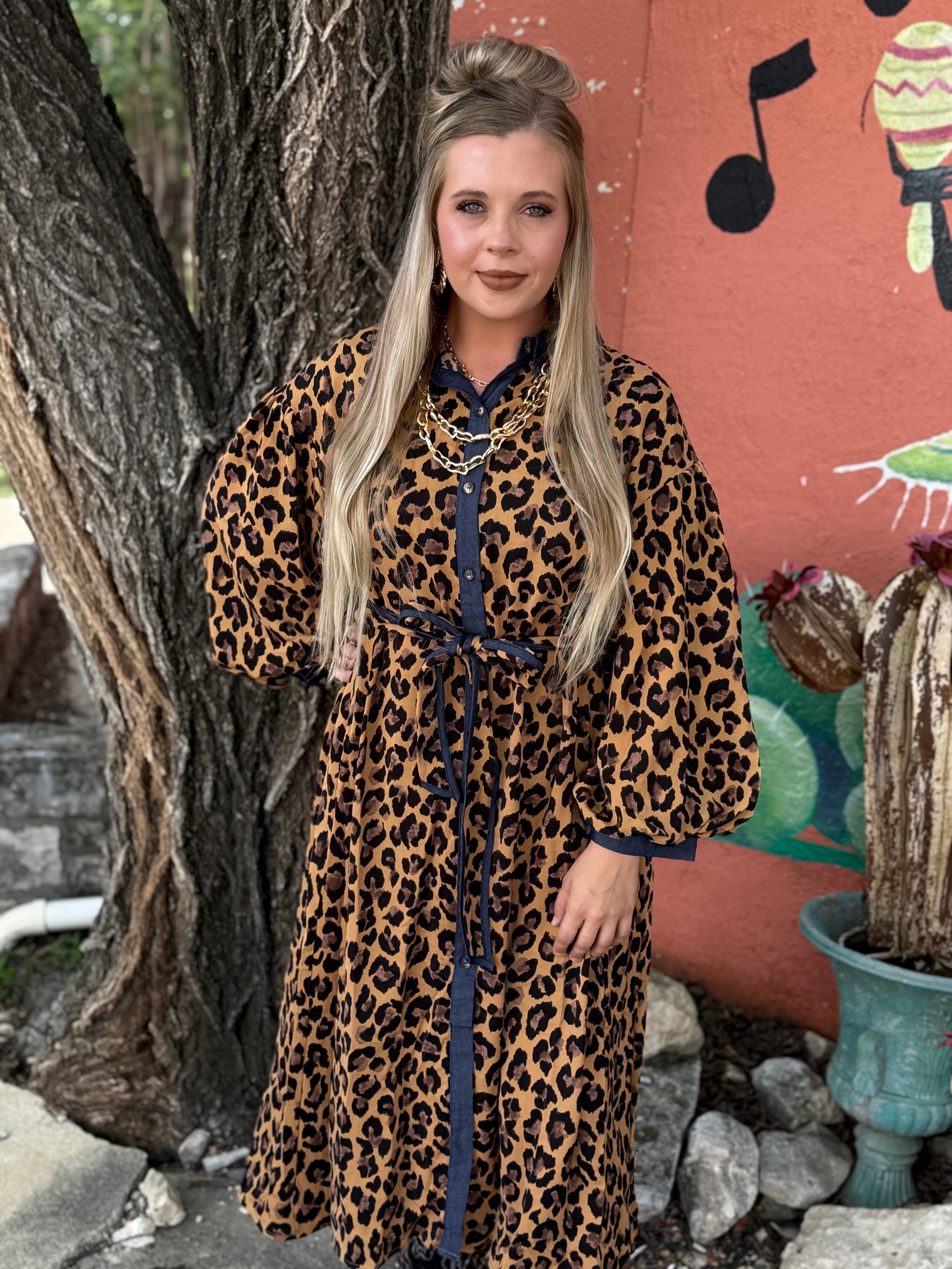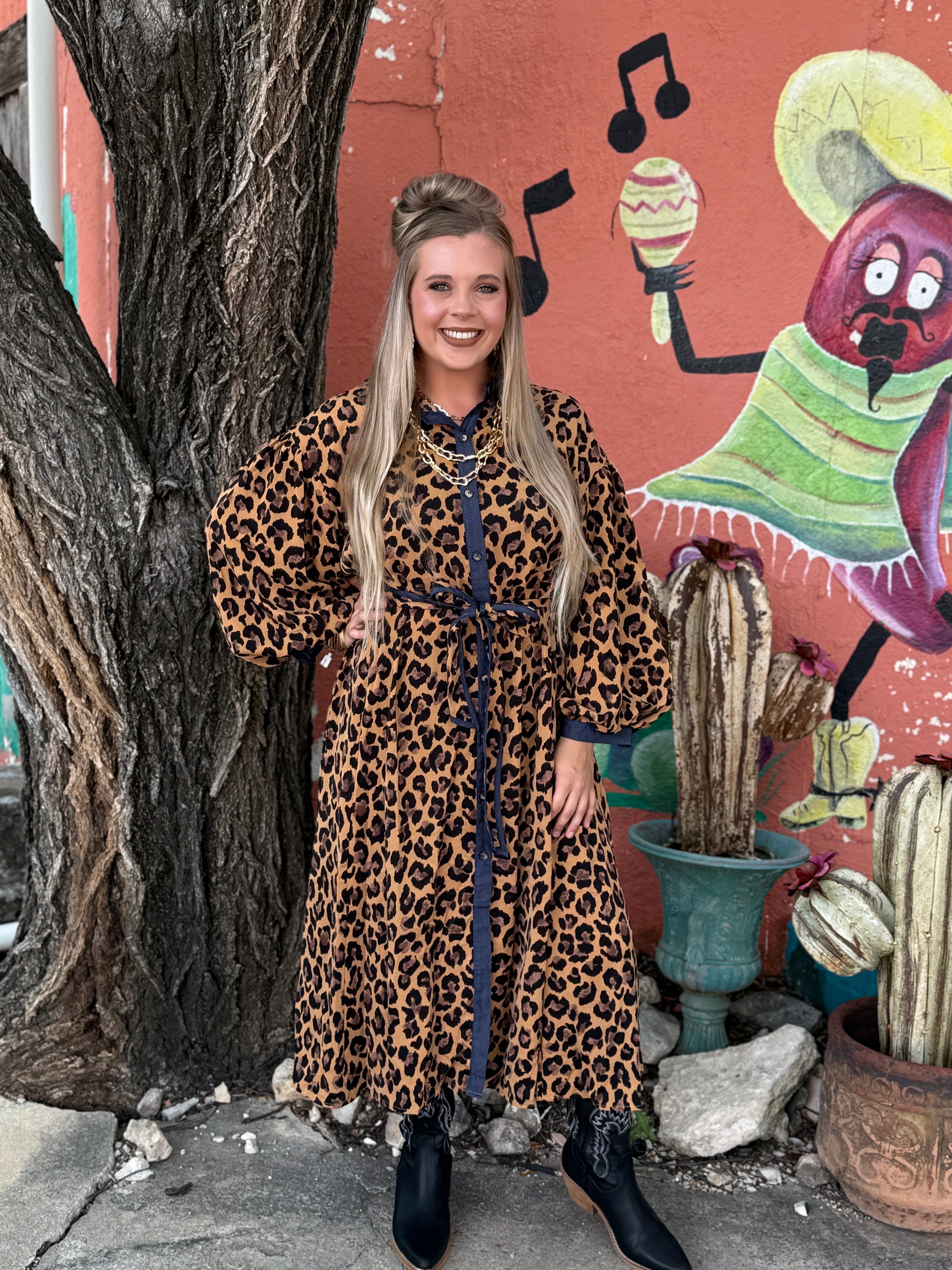 Embrace bold southern charm with the Velora Leopard Midi Dress. Featuring 3/4 puff sleeves and a classic button-down front, this dress combines a fierce leopard print with solid contrast details for a stylish touch. The waist tie highlights your silhouette, while side pockets add practical convenience. Perfect for any occasion where you want to look effortlessly chic with a little wild flair.