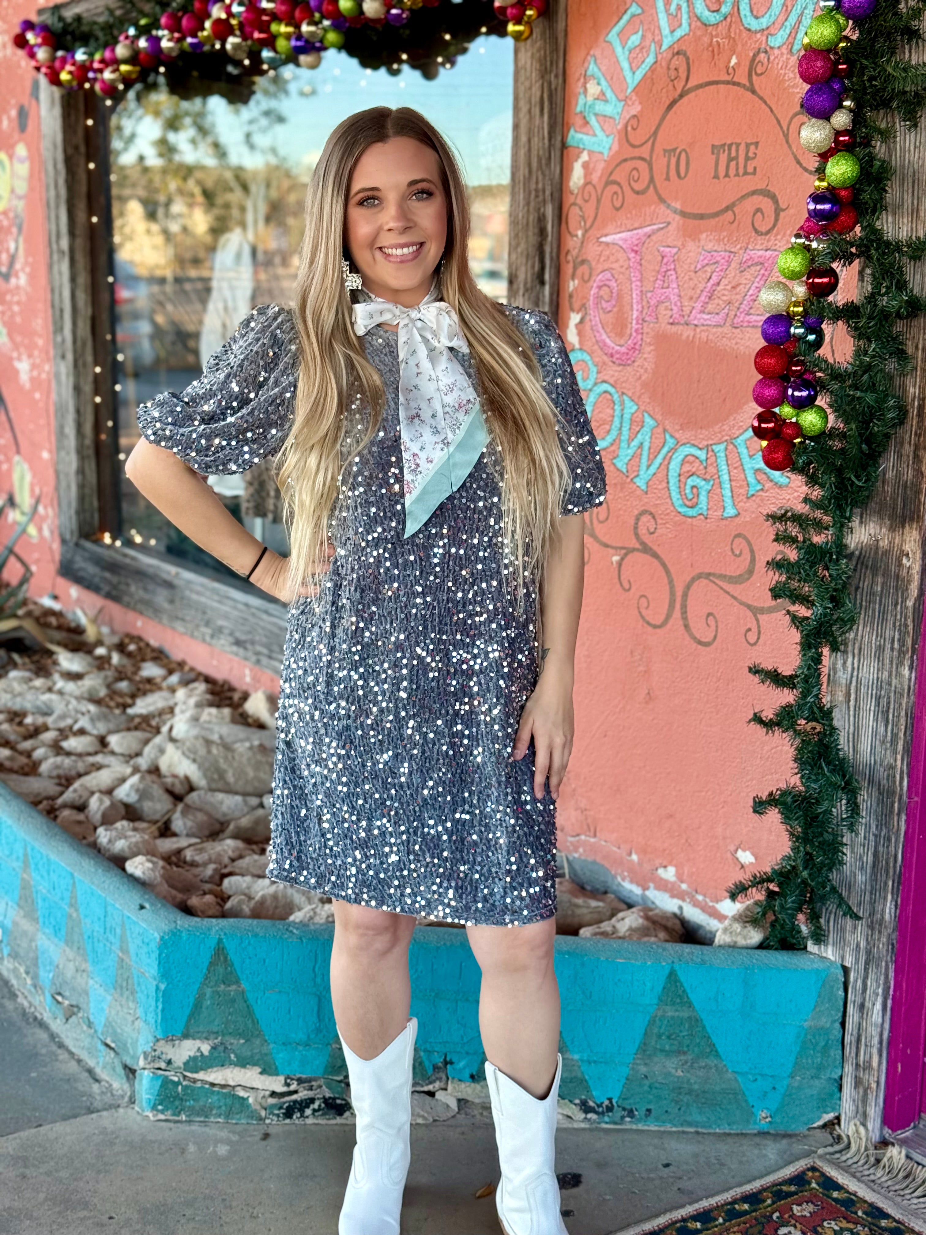 This velvet sequin dress brings a touch of Southern sparkle made for nights under warm lights and lively gatherings. Its soft grey shimmer and elegant knee-length cut give it that sweet mix of grace and grit every Southern belle carries with her. Whether you're stepping into a holiday party, a hometown celebration, or a night out that calls for a little shine, this dress is ready to help you glow.