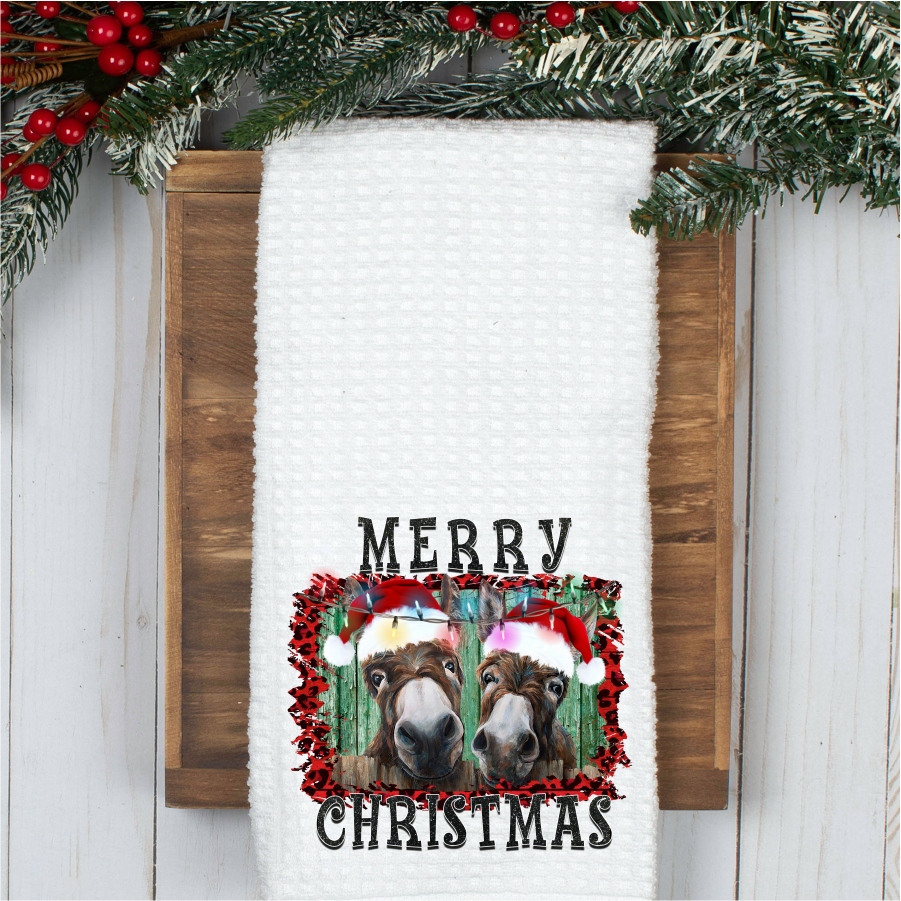 This charming hand towel features a delightful donkey Christmas design printed with our durable, fade-resistant technique. The soft waffle weave fabric offers a gentle touch without that clingy microfiber feel, making it perfect for everyday use in your kitchen or bathroom. Built to last, these towels hold up beautifully through countless washes—even with bleach—while keeping that vibrant holiday print looking fresh and crisp. A practical and festive addition to any home!