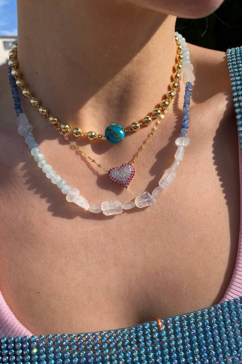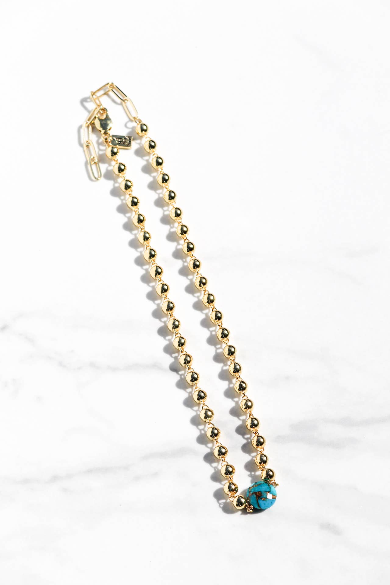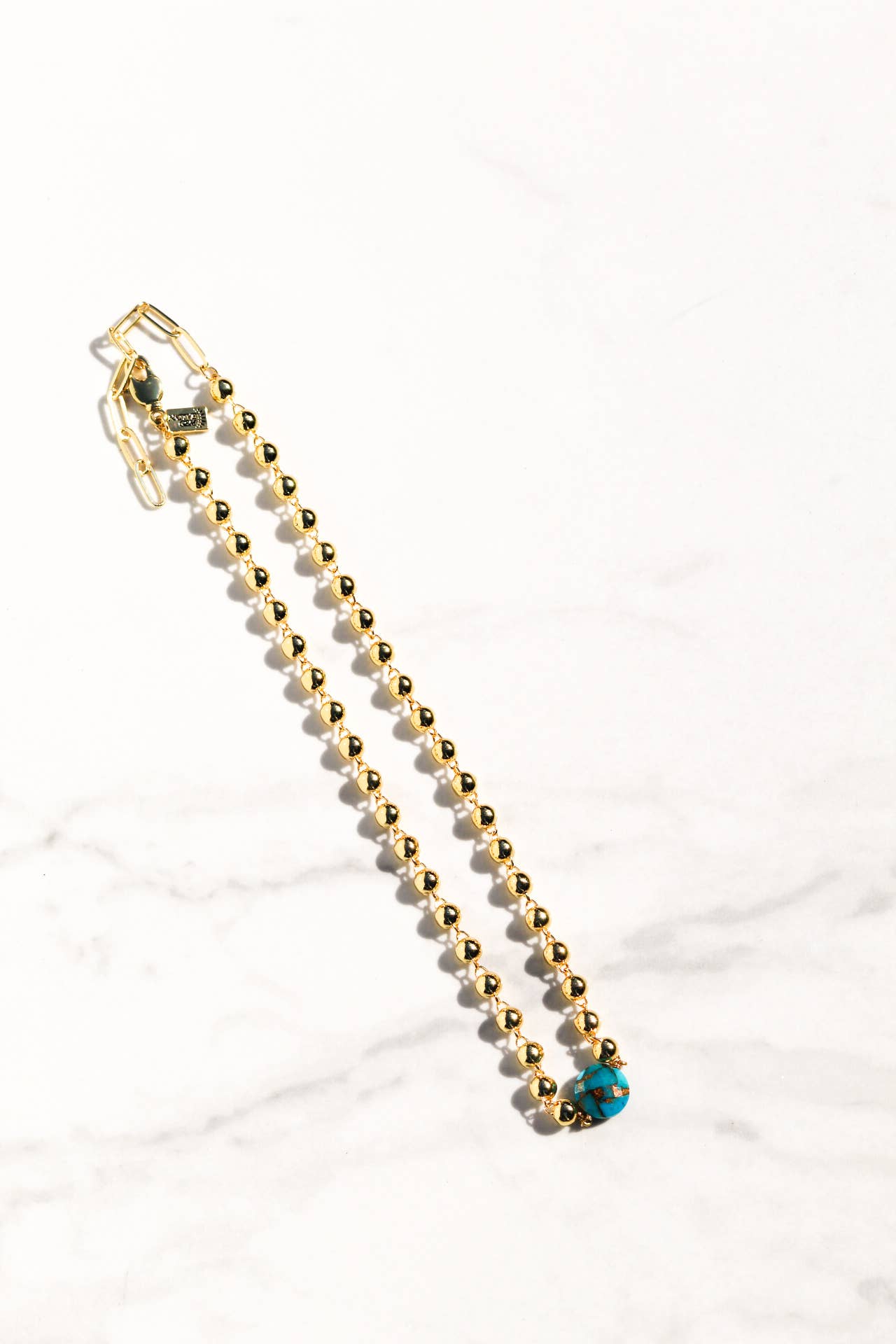 This adjustable 14-16" necklace features a 6 mm gold-plated stainless steel ball chain with a striking copper turquoise stone. Turquoise is known as a token of friendship, aiding communication and bringing peace to your home. It balances masculine and feminine energies, encouraging self-awareness and creative thinking. When gifted by a dear friend, it shields you from negativity and invites good luck. Crafted with care using hypoallergenic, lead- and cadmium-free metals like 14K gold fill, vermeil, and sterling silver, this piece is made to be treasured and worn daily.