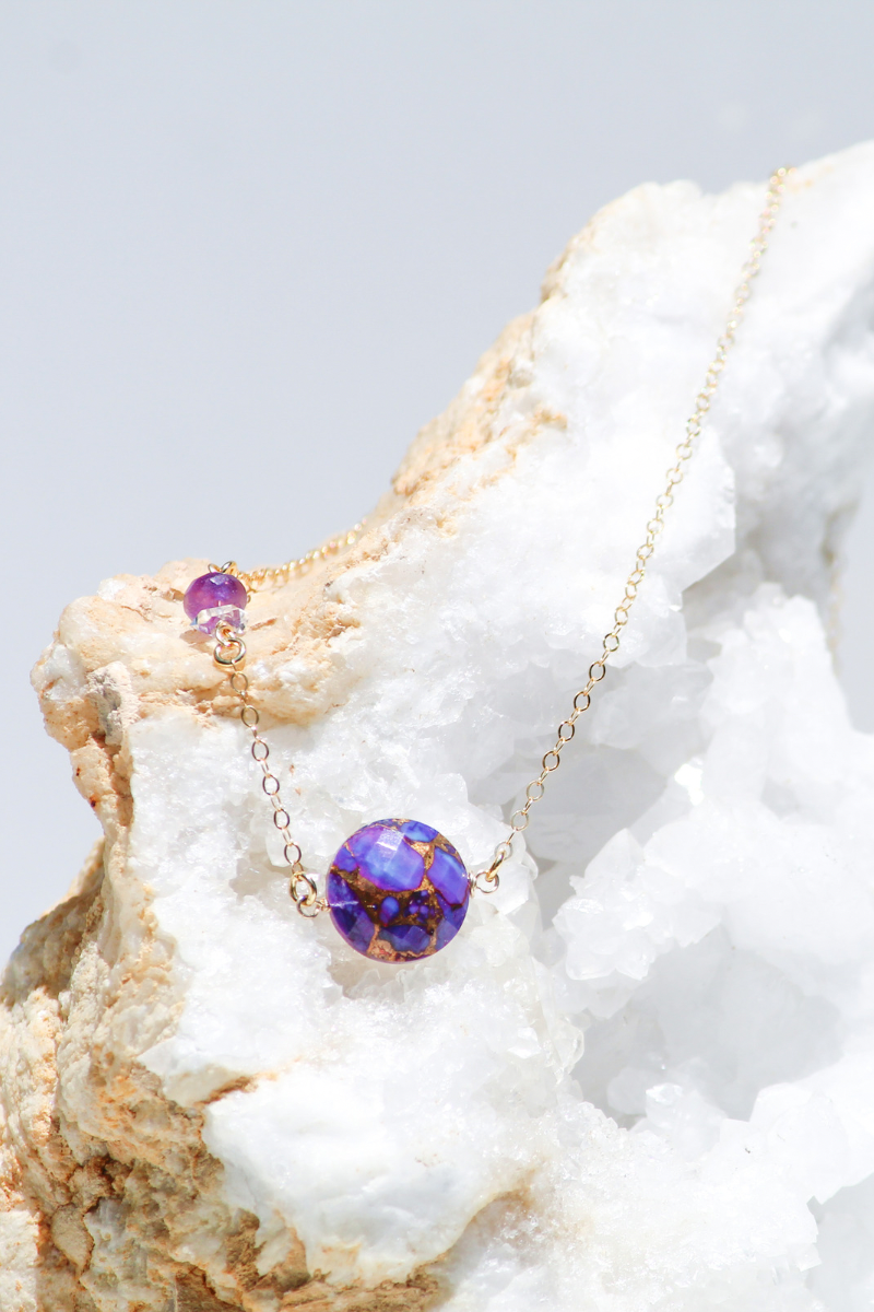 This purple Mohave turquoise circle pendant shines on a 16-18” adjustable 14K goldfill chain, accented with a delicate Herkimer diamond. Known for its warm golden and copper webbing, Mohave turquoise comes from genuine Arizona Kingman turquoise that's been heated, dyed, and stabilized for lasting beauty. It’s a stone of compassion and forgiveness, carrying deep wisdom meant to be felt, not forced. Crafted with care, this piece uses hypoallergenic, lead- and cadmium-free metals like 14K goldfill, bridging the gap between cheap and high-end jewelry you’ll treasure for years.