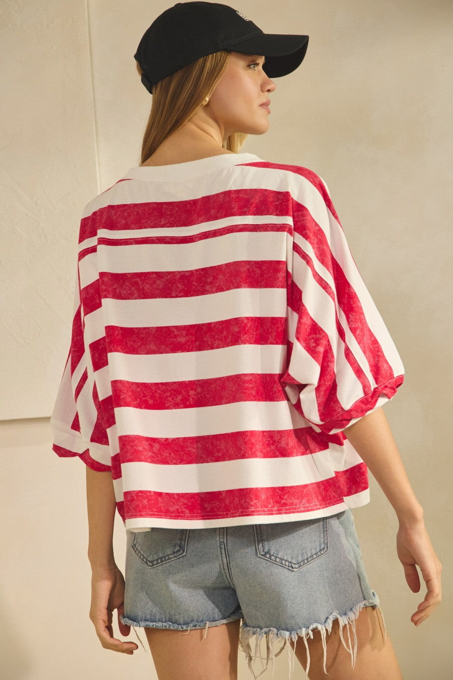 An easy off-white striped oversized top with the cutest star applique for that laid-back western charm. Comfy, casual, and made for pairing with denim, boots, or sneakers.