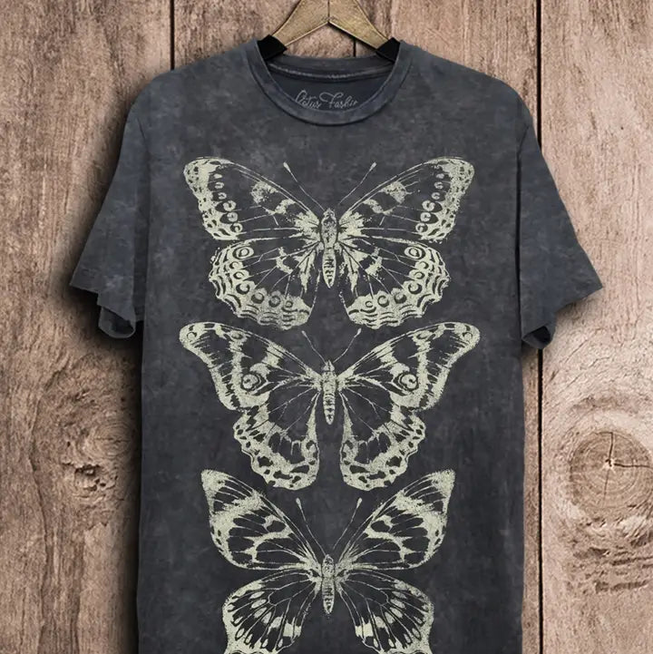 The Butterflies Graphic Top Vintage Black Mineral brings effortless vintage charm with a relaxed boyfriend fit. Designed in a soft mineral-washed black cotton, this tee features butterfly graphics that add a playful yet laid-back edge to your everyday style.
