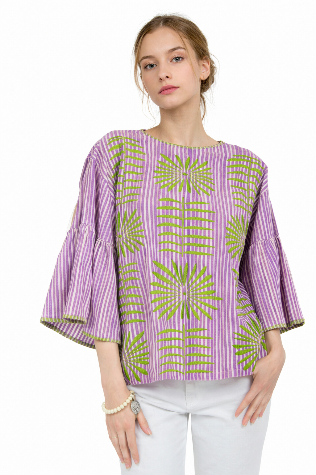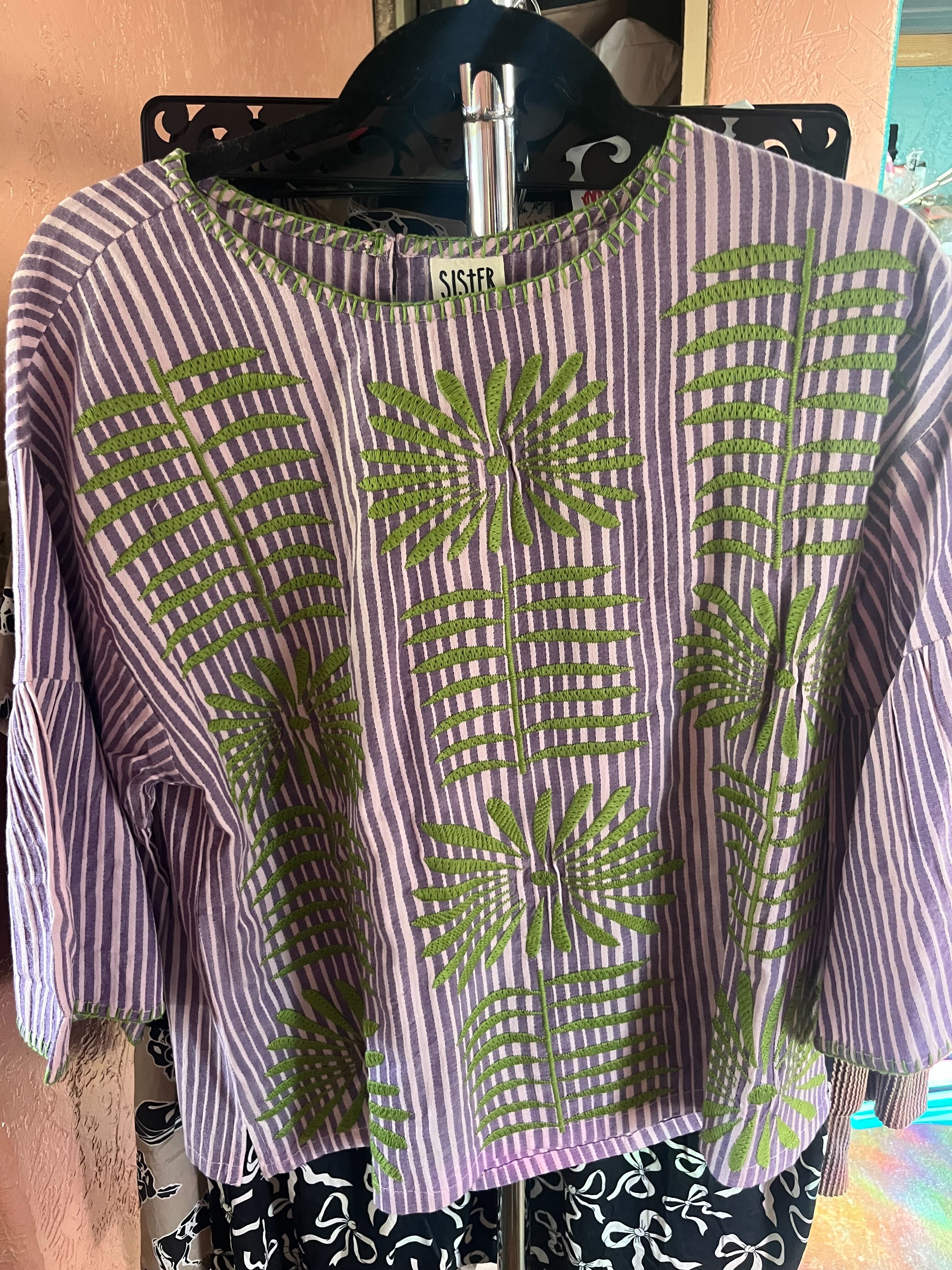 The Elena top blends soft structure with standout detail, featuring a two-tone purple striped design accented by intricate green embroidery on both the front and back. Made from breathable 100% cotton, it delivers all-day comfort with a polished, boutique-ready feel.