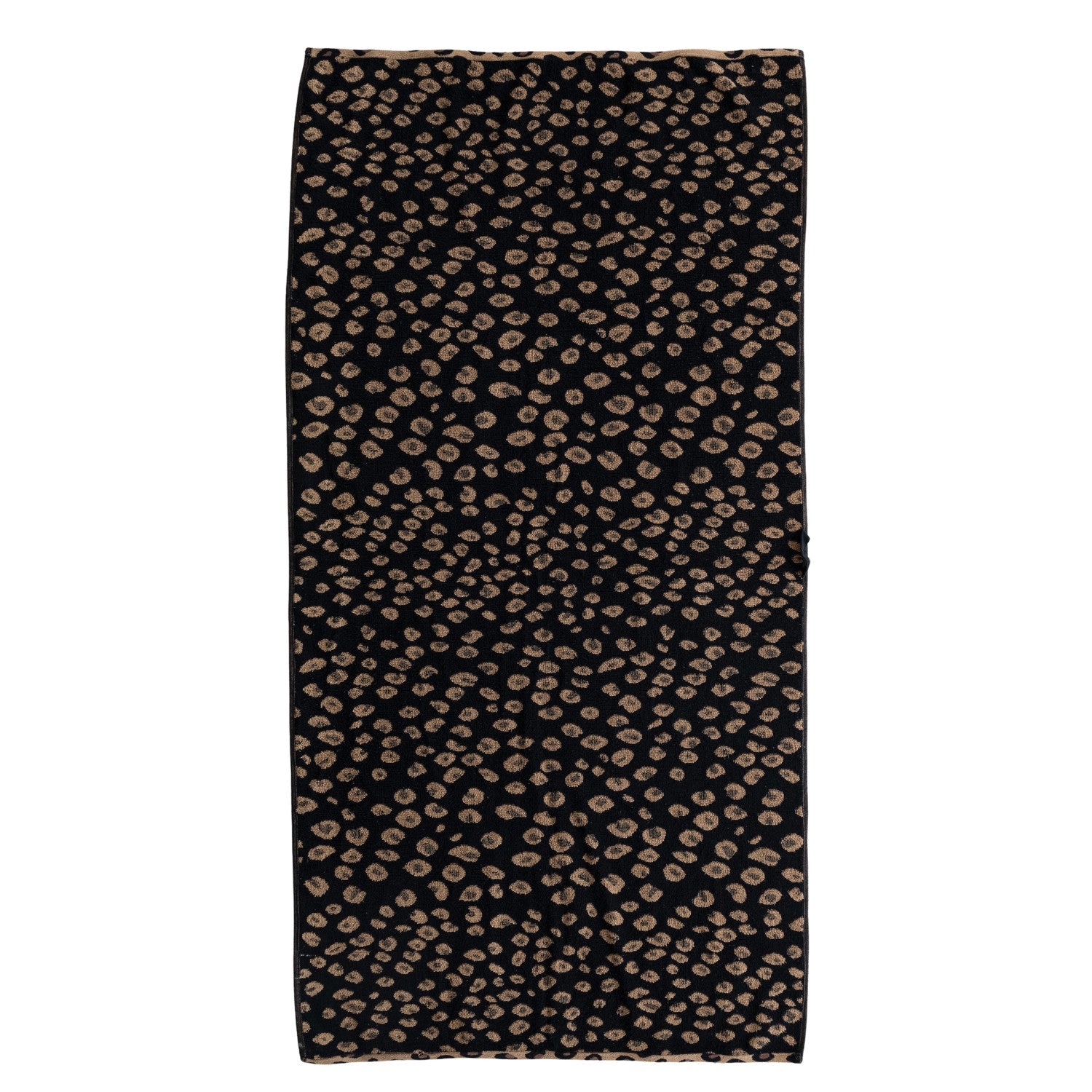 This woven cotton terry bath towel features a bold brown and black leopard print for a stylish, eye-catching look. Designed with a handy loop for easy hanging, it brings both comfort and function to your bathroom.