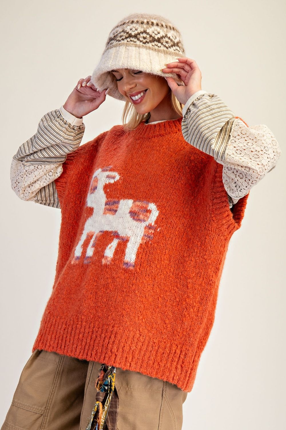 Inspired by life on the open range, this rust calf-patterned sweater vest brings cozy western charm with an effortless silhouette. The soft fuzzy knit and relaxed, oversized fit make it perfect for layering through cooler seasons. Finished with classic ribbing and dropped shoulders, it’s a statement piece that feels both playful and rooted in western style.