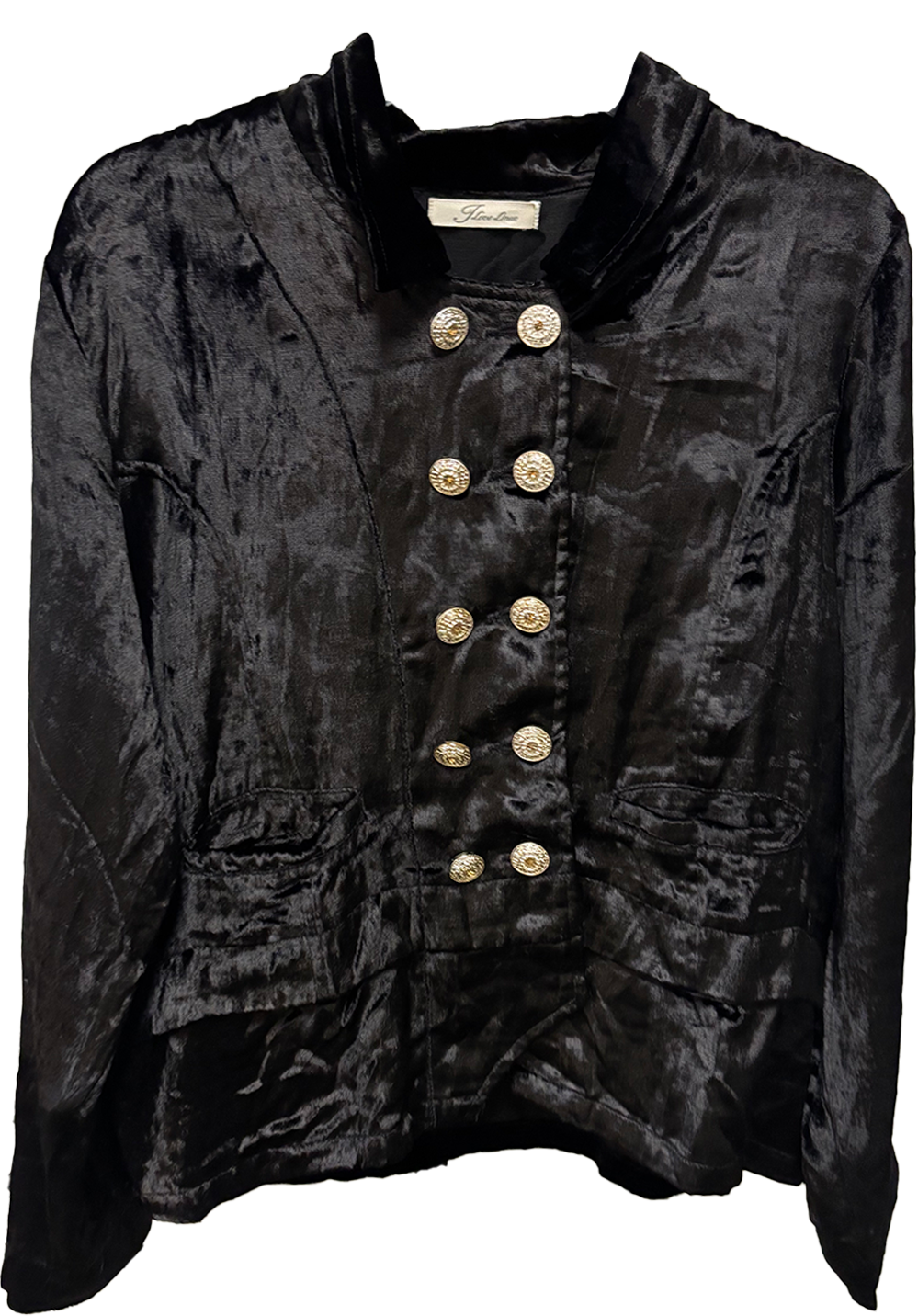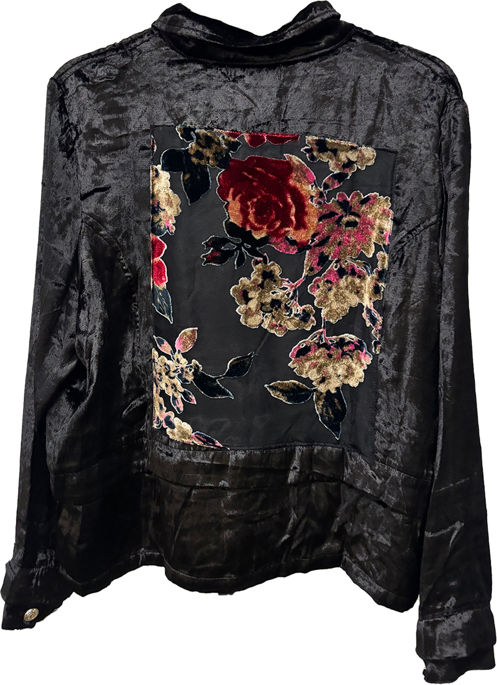 March into fall with undeniable edge in this black velvet military jacket designed to make a statement. Crafted from soft rayon velvet, it features gold-tone military buttons and a dramatic burnout velvet floral appliqué across the back that creates striking contrast. With its relaxed fit, drop shoulders, and raw-edge cuffs, this jacket layers effortlessly over tees, blouses, or dresses for a bold, elevated look.