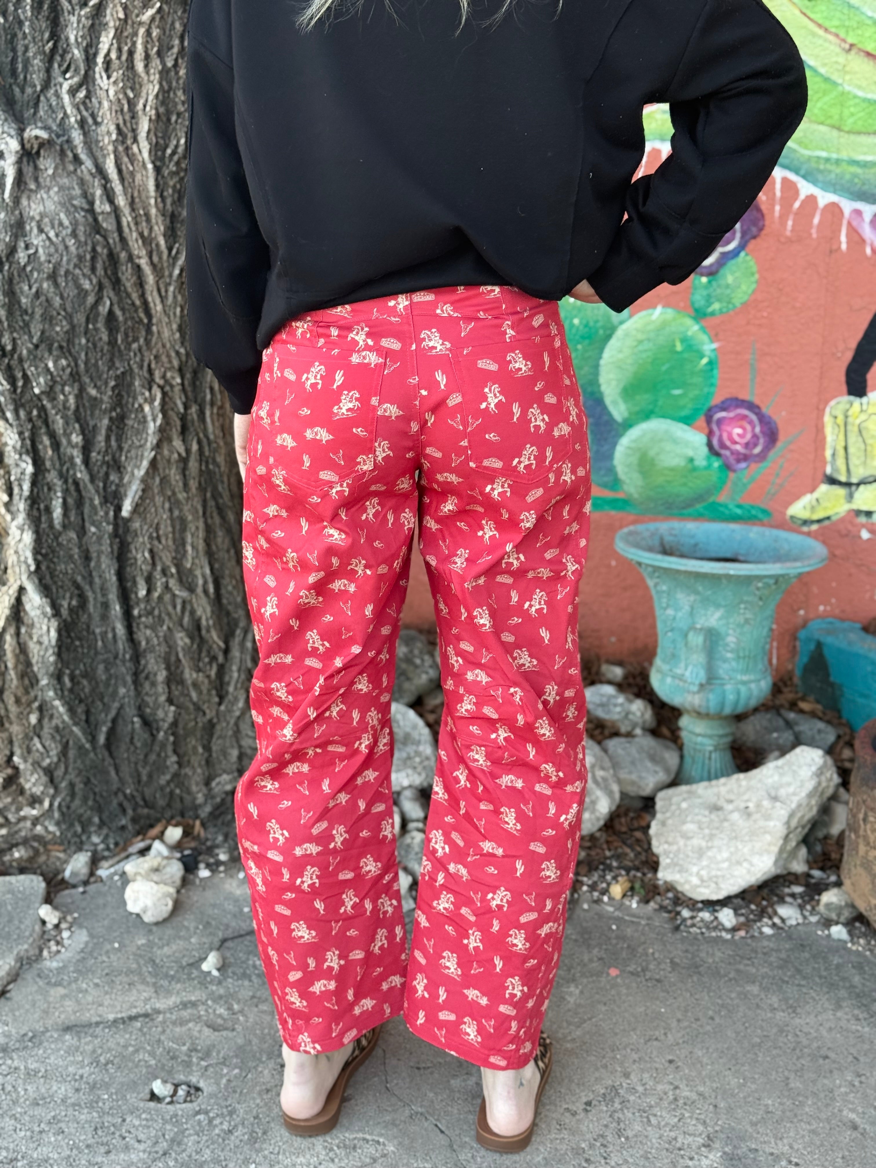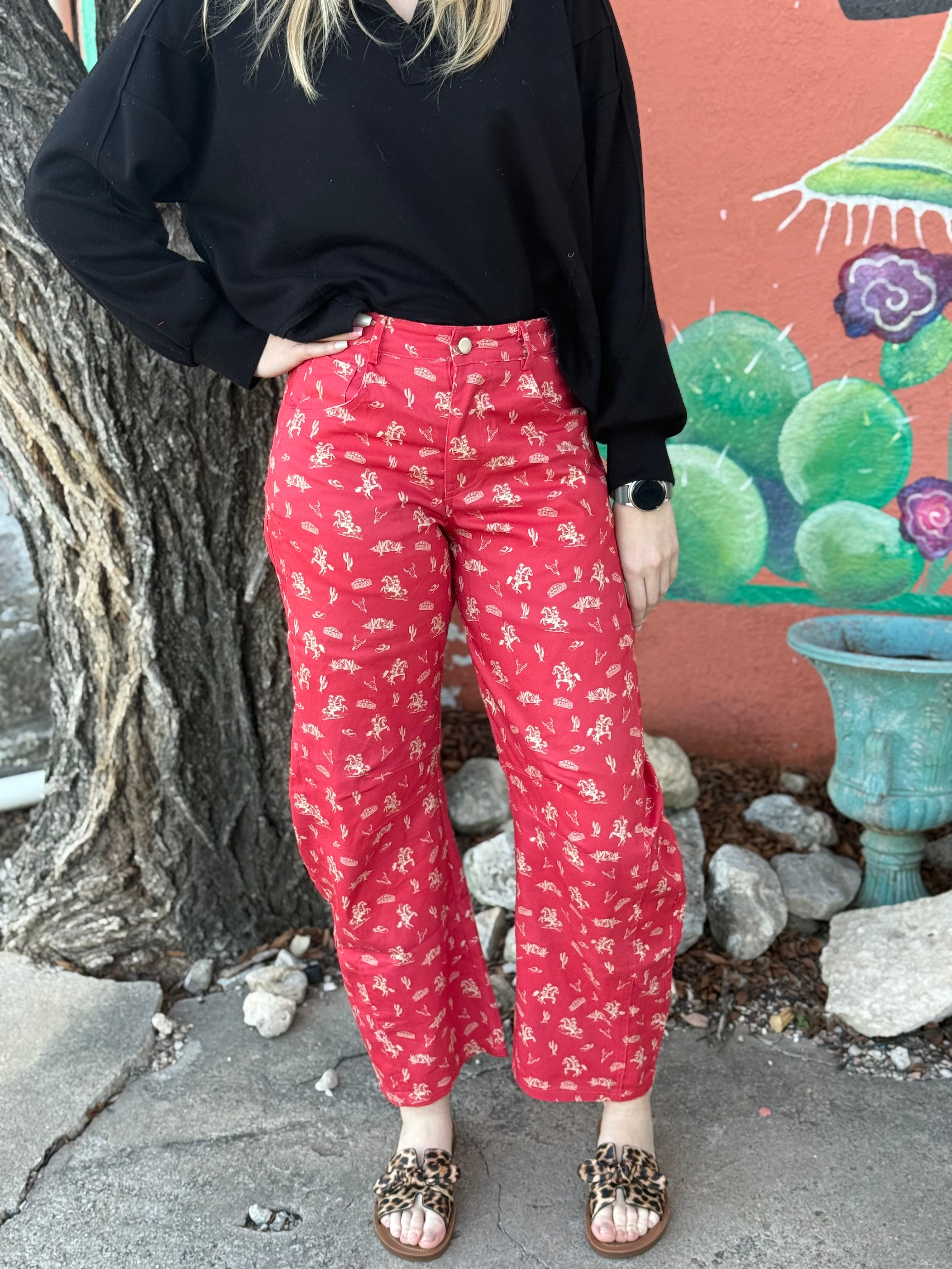 Make a bold statement in these Cowboy Motif High-Waist Pants, featuring an all-over Western print of cowboys, horses, and cacti. With a flattering high-waist fit and barrel-leg silhouette, these playful trousers are perfect for elevated casual outfits or styled simply to let the print steal the show.