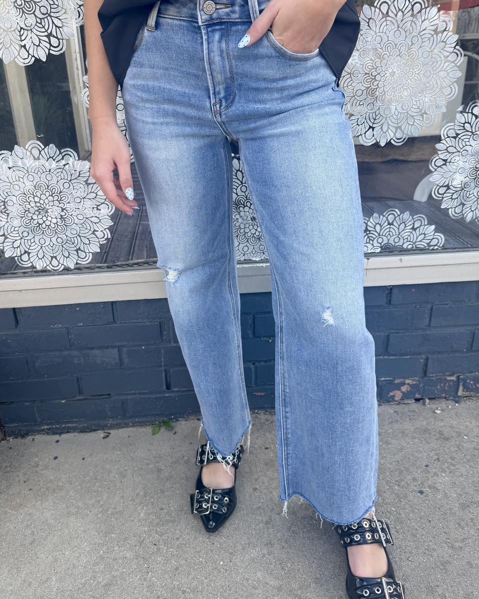 The Medium Wash High Waisted Wide Leg Raw Hem Jeans are the perfect mix of classic denim and effortless edge. With a flattering high-rise waist, wide-leg silhouette, and raw hem finish, these jeans are made to elevate your everyday outfits with laid-back confidence.