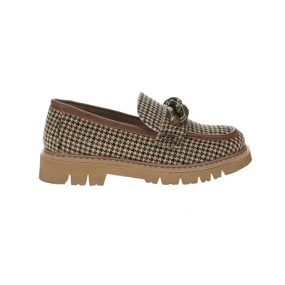 These houndstooth loafers bring classic style with a fresh twist—your new favorite for everyday elegance. Featuring a striking oversized chain and a chunky lug sole, they mix luxe and casual vibes effortlessly, pairing perfectly with jeans, trousers, or a sharp blazer. Comfortable enough to wear all day and stylish enough to steal the show.