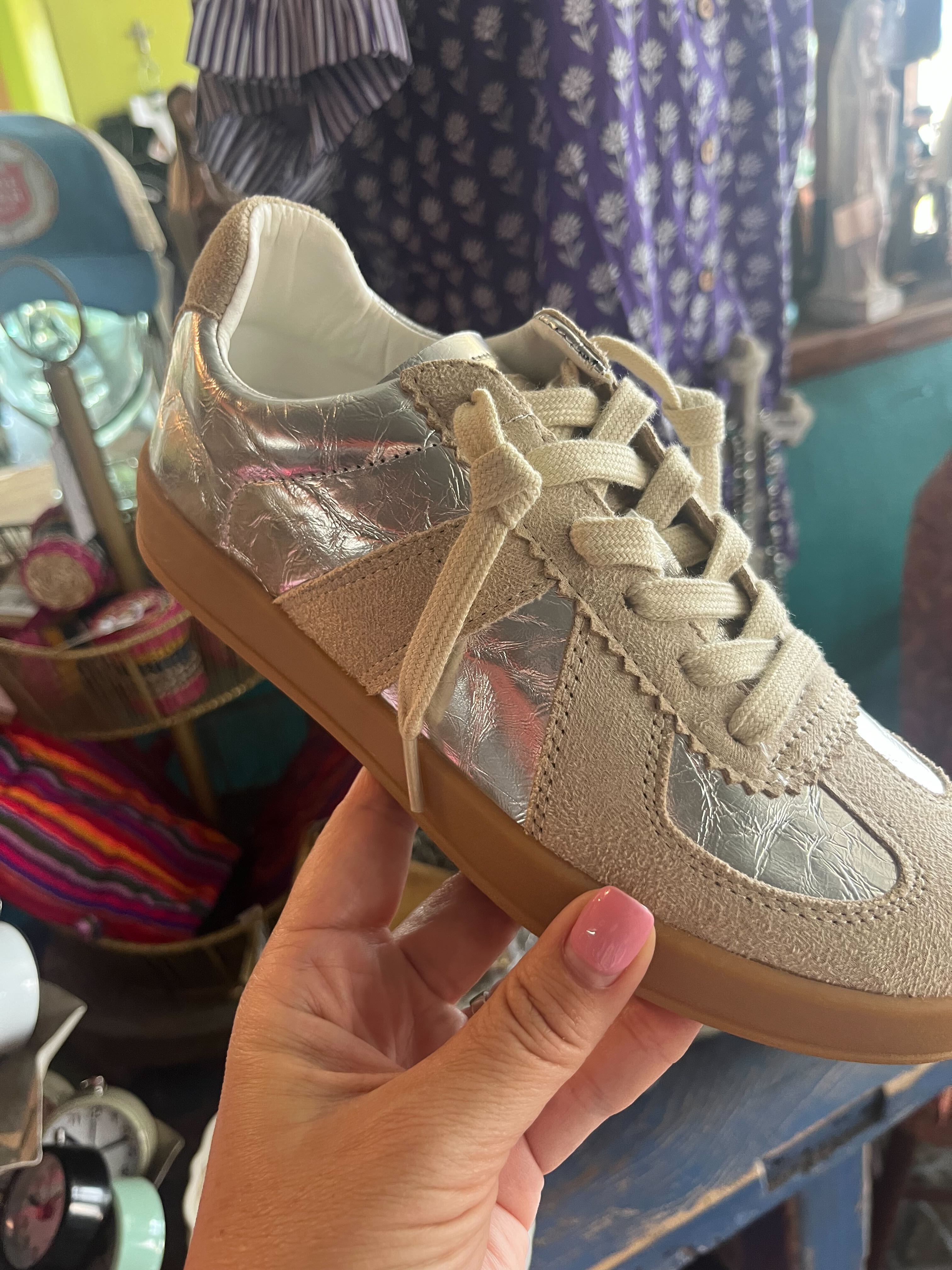Step up your game day flair with the SparkStride Vera Silver Sneaker! These shiny silver kicks bring just the right amount of sparkle while keeping your feet comfy and ready to move. With a classic lace-up style and a cozy fit, they’re perfect for cheering loud or cruising around town.