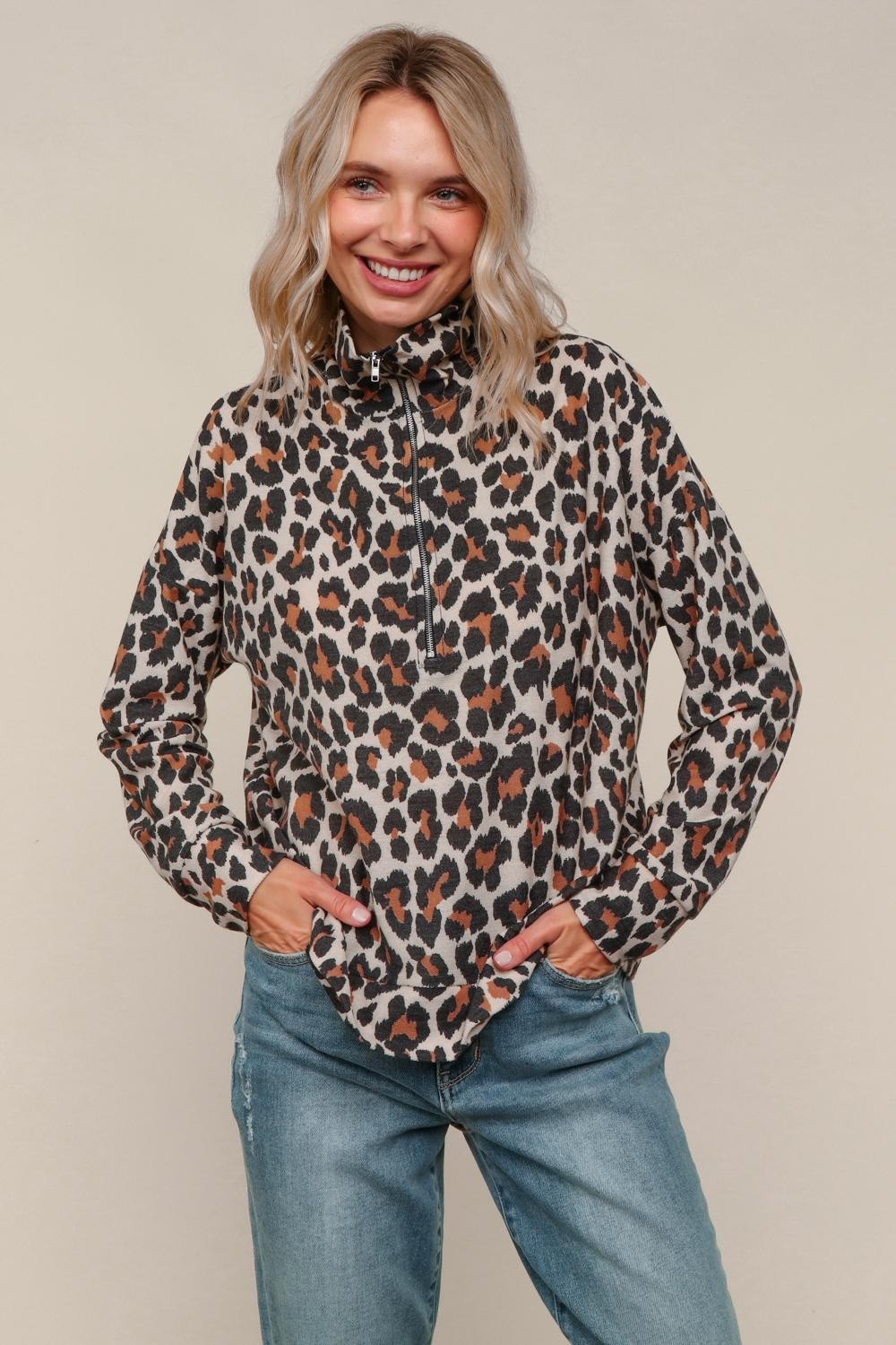 Luck and  Leopard Zip Sweater Top is where cozy meets bold style. With its soft French terry fabric, chic high neck, and half-zip design, this leopard print knit is perfect for layering or wearing solo when you want that effortless, standout look.