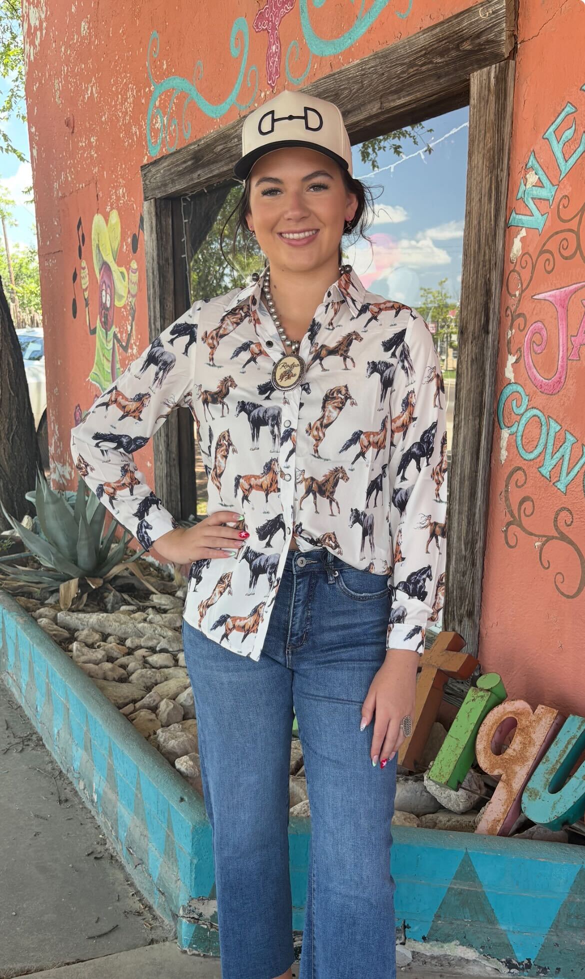 Ride through your day in bold Western spirit. This shirt mixes cowboy grit with clean tailoring, featuring a lively horse print that brings a dash of rugged charm to any outfit. Easy to style, easier to love.