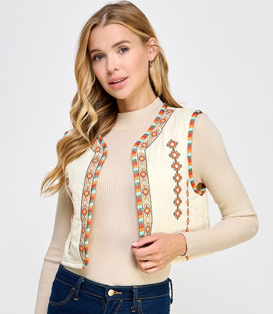 Turn heads in our Embroidery Detail Vest — a statement piece that adds instant charm to any outfit. With intricate stitching that pops and a fit that flatters, this vest brings a playful, artsy edge to your look. Layer it up, dress it down, and let your style do the talking!