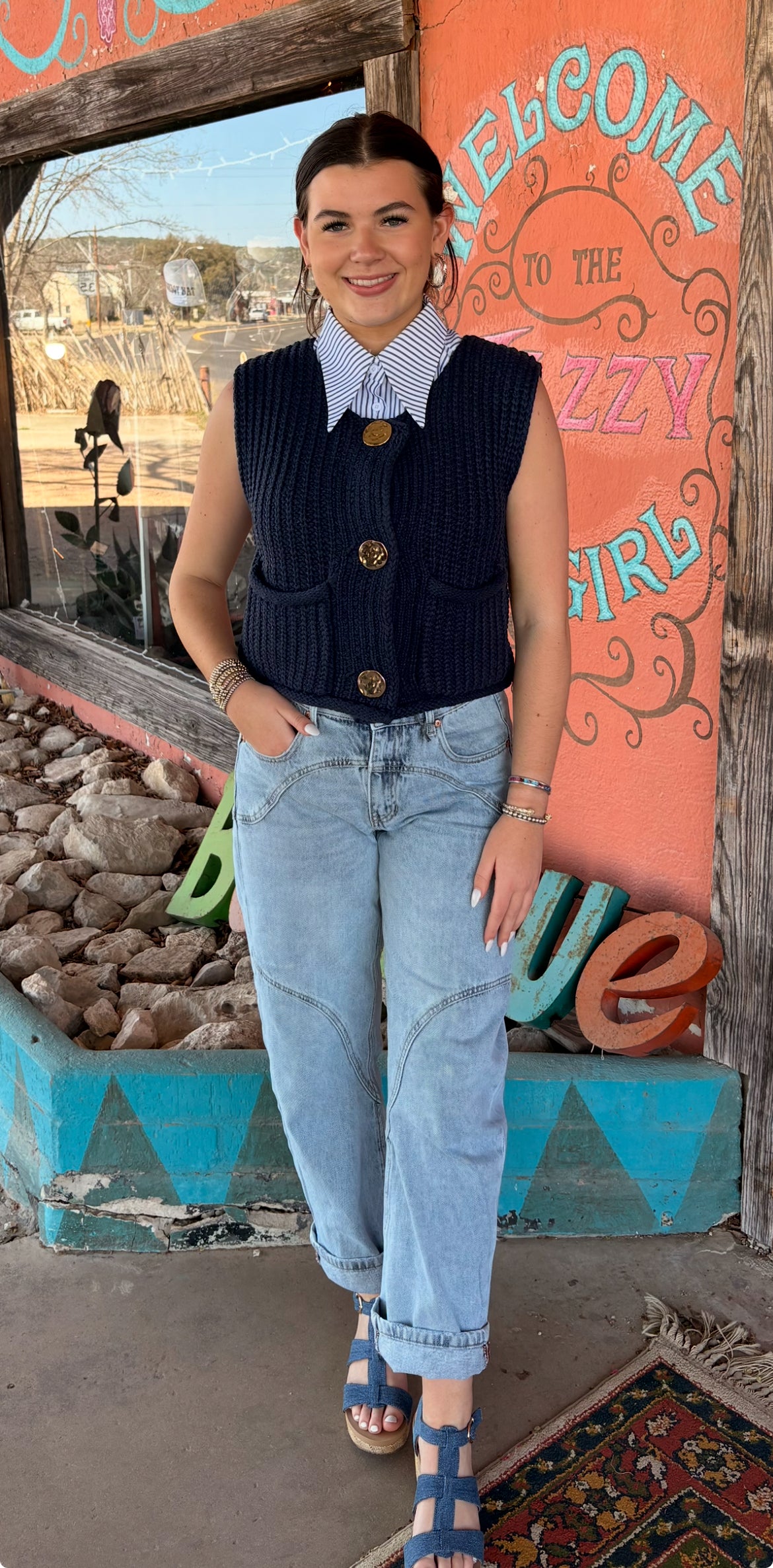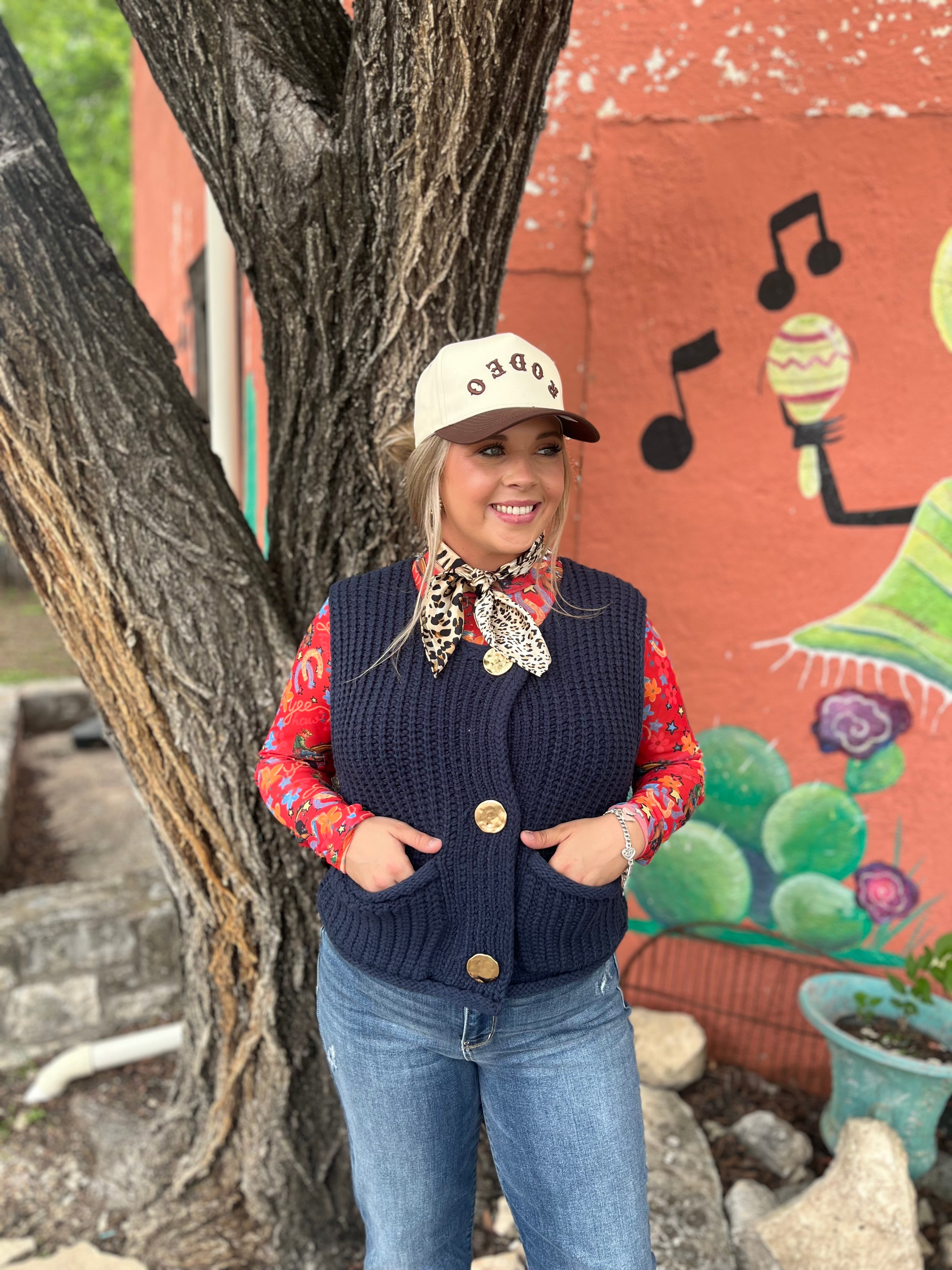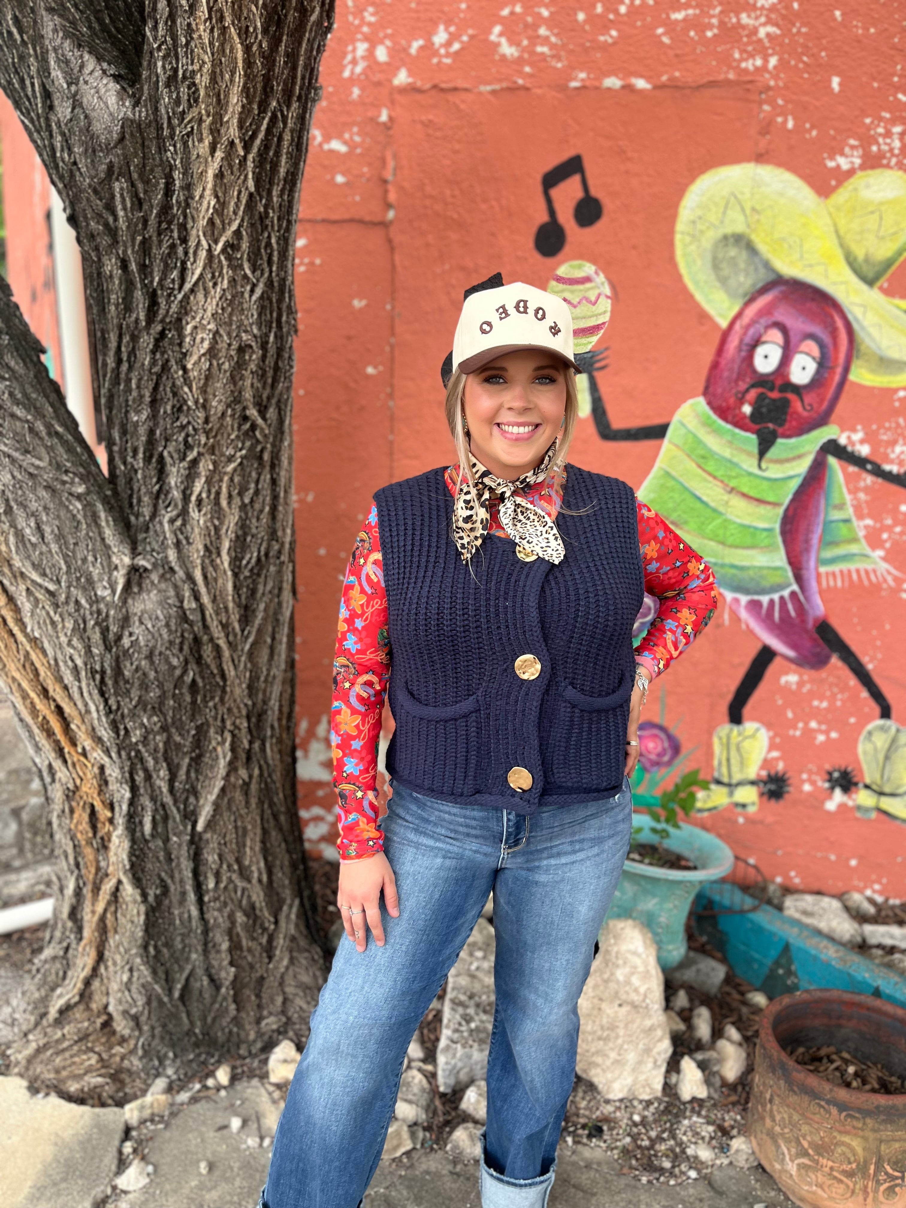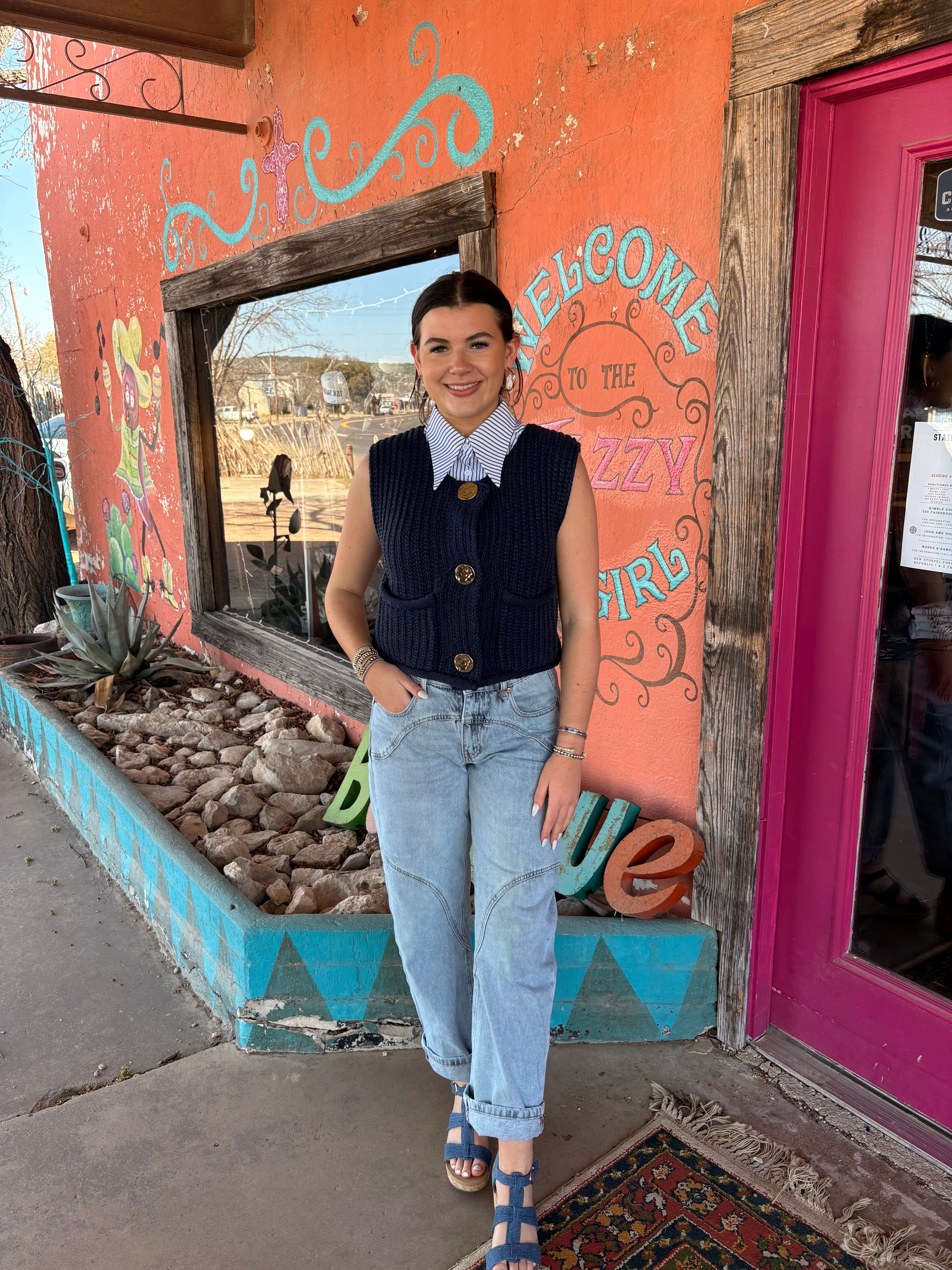 The Mack Sweater Vest is a chunky, sleeveless knit with a round neck and gold button-down front. Featuring a solid design and functional pocket, it’s a stylish and versatile layering piece for any season.