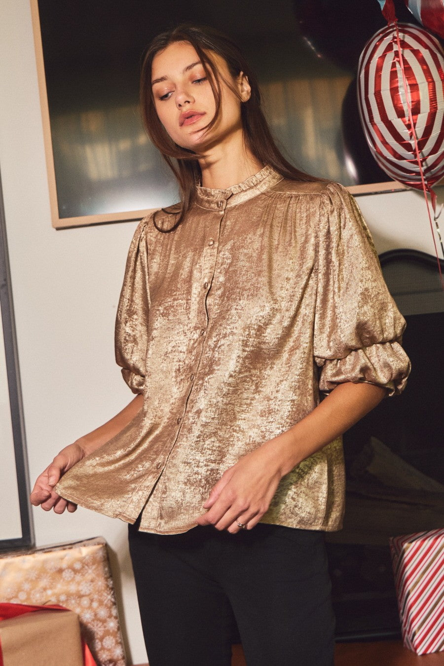 Madi Mae in Champagne Top is a showstopper that'll have you feeling like the belle of the ball. This shimmer foiled button-front blouse features a charming ruffled band collar and romantic double balloon sleeves that add just the right amount of flair. Perfect for dressing up your everyday look or standing out at special occasions, this piece brings that touch of sparkle and sophistication every wardrobe needs. Pair it with your favorite jeans or dress it up for a night out—either way, you'll be turning heads, sugar.