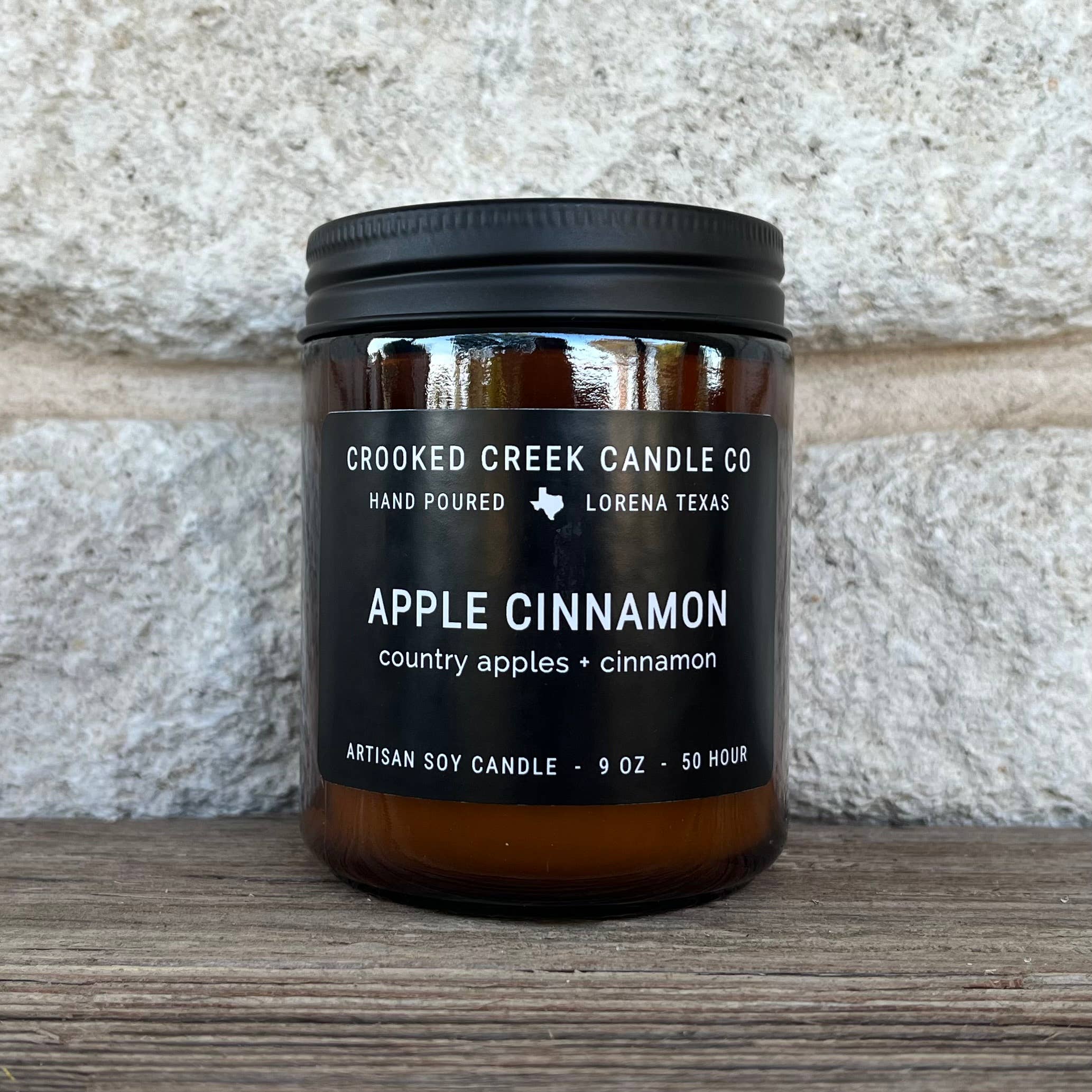 Country apples blended with fresh ground cinnamon for a warm and cozy scent Our candles are made in small batches using our natural soy wax blend, cotton wicks and premium phthalate-free fragrance oils. We hand pour each candle in beautiful amber glass jars with our signature black label and metal lid. Each candle will burn for 50+ hours.